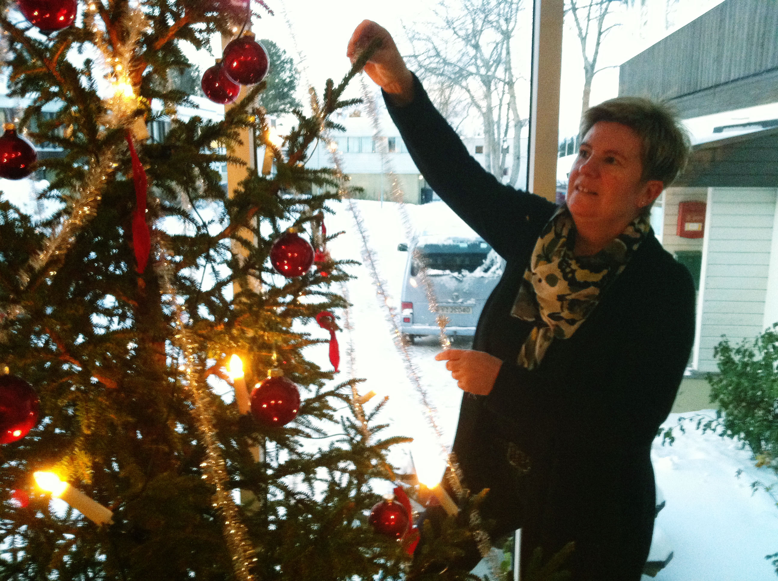 Det pyntes til jul rundt om på skolen, og her ser vi en av de flere kontoransatte pynte juletreet i hovedbygget.