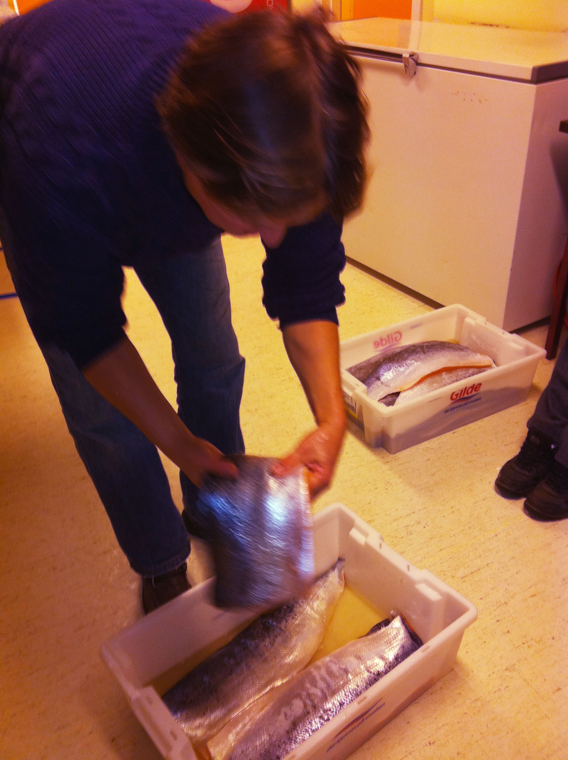 “Lørdagsaktiviteten” igår var å lære å rø(y)ke laks. Det startet på fredag med salting og også faktisk sukring. Deretter skylte vi dem og la dem ut til tørk igår. Idag har vi vært i Kabelvågmarka og lett opp einer, og på mandag skal vi røyke dem.