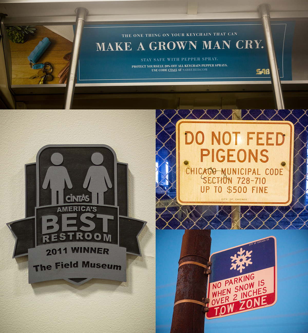 Signs. Weird ones. Blue ones. Chicago hosts a diverse collection… Remember to keep a ruler in your car so that you can check if parking is legal or not during winter times. Will there be more snow? Will the magical 2 inches be reached? Playing with fire, are we? Or how about a 500 dollar fine for feeding the pigeons?