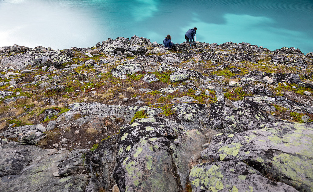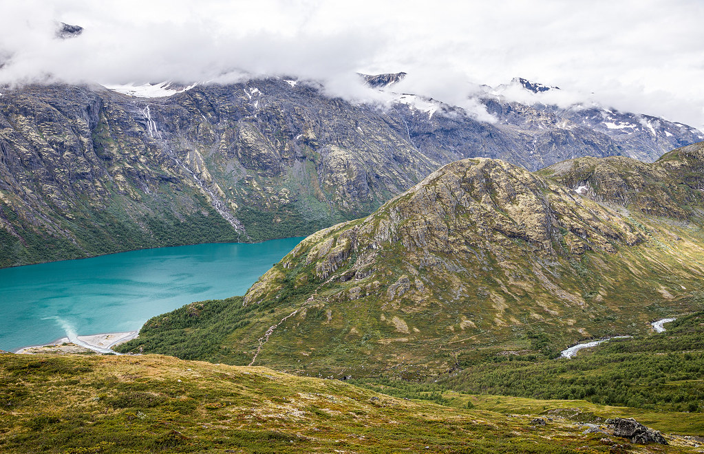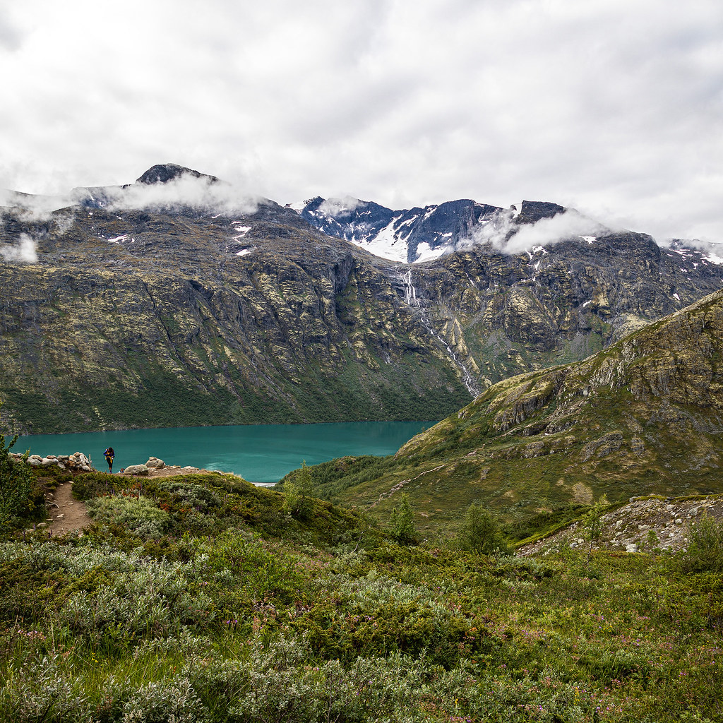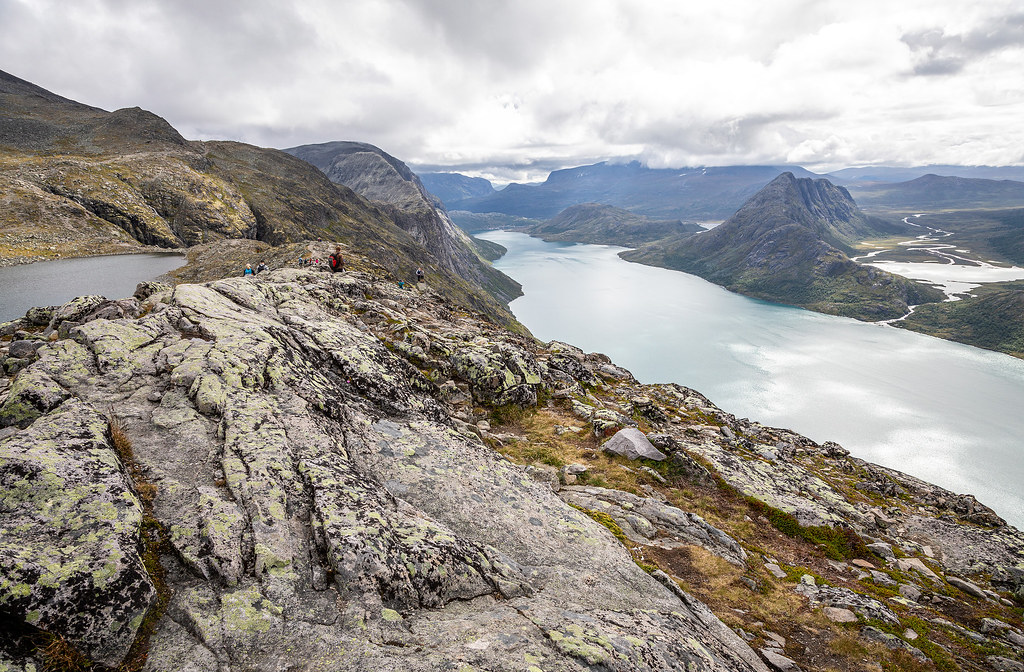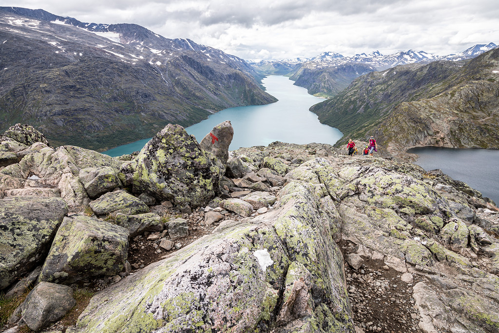 Besseggen lies east in Jotunheimen, between the lakes Gjende and Bessvatnet. The walk over Besseggen is one of the most popular mountain hikes in Norway. About 30,000 people walk this trip each year.